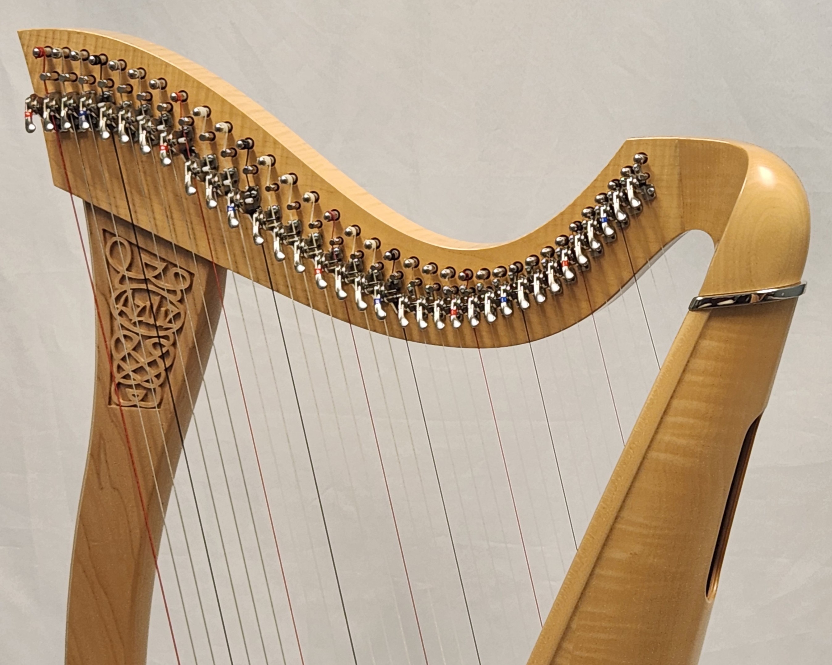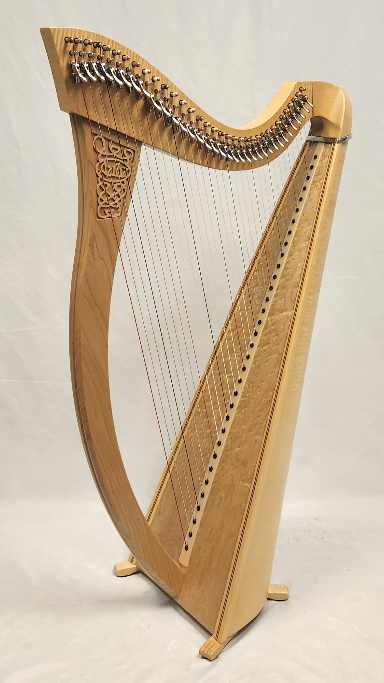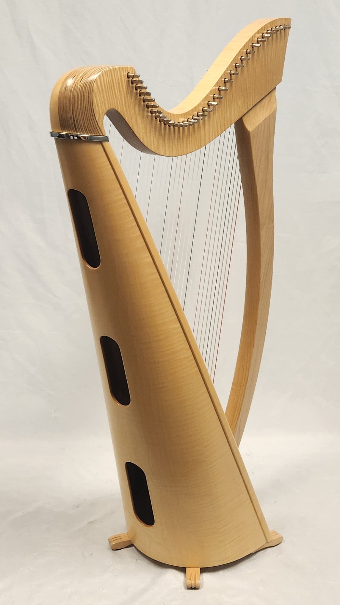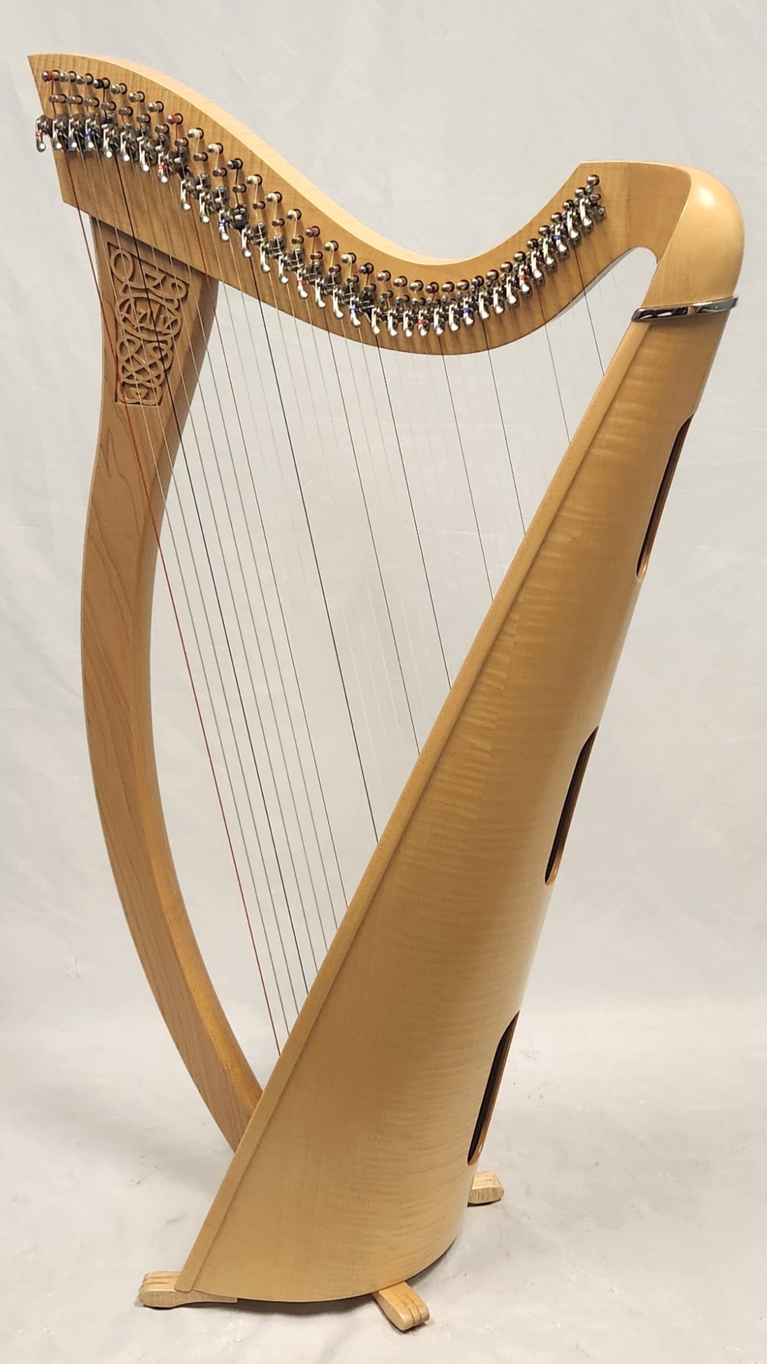 This preowned consignment harp was built in 2024 and has only had one owner. It is in excelent cosmetic and structural condition and includes a blue padded transport cover and tuning key.